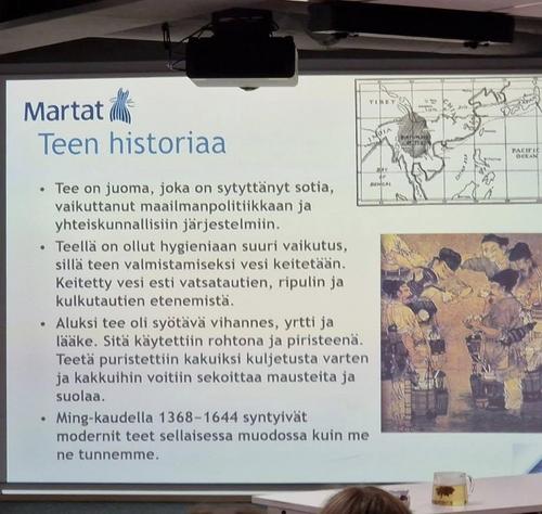 Saimme tänään tuhdin tietopaketin teestä. Ulla Laaksonen kertoi mm. teen historiasta, viljelystä, käsittelystä ja eri teelaaduista. Maistelimme oolong-teetä, valkoista teetä, vihreää teetä ja puer-teetä. Monille uusia tuttavuuksia. Teen kanssa myös nautimme pieniä suolaisia ja makeita suupaloja, kuten teekulttuuriin kuuluu.