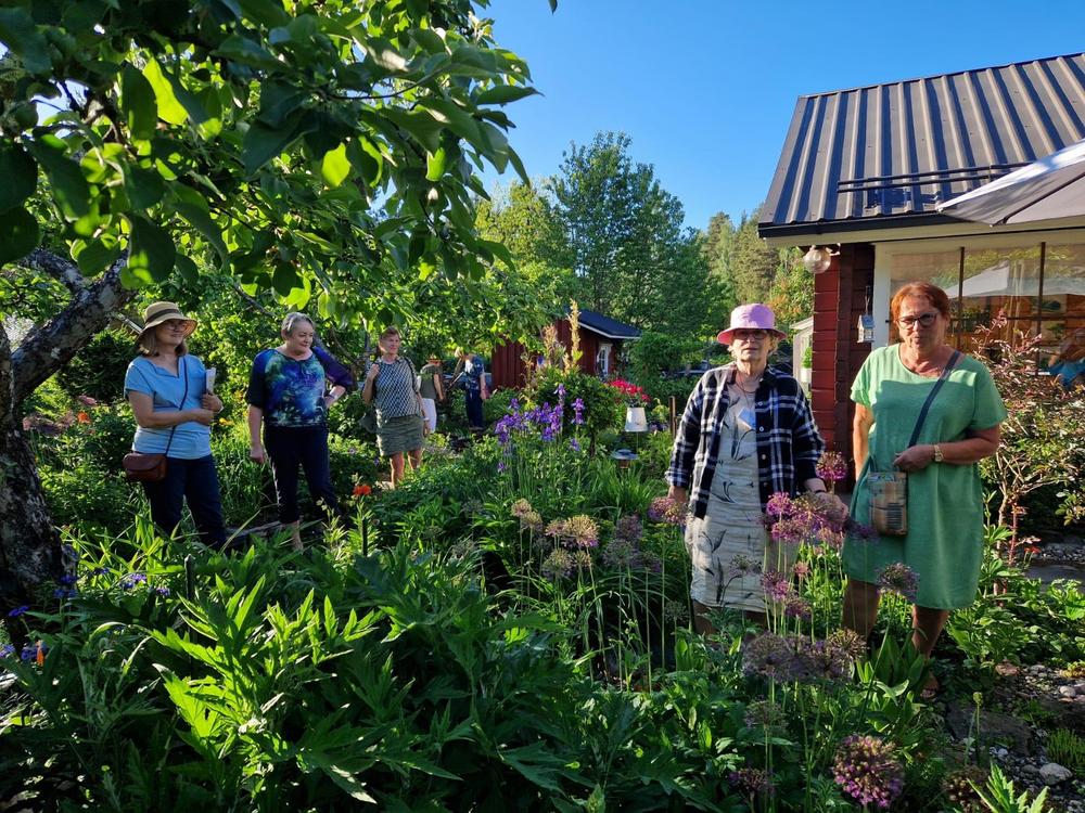 Piharetken jälkeen puutarhapirtissä odottivat ihanat herkut, Leilan, Ullan ja siirtolapuutarhayhdistyksen Pirjo-emännän taidonnäytteet. Maistoimme jännittävää hortahakkelusta ja mehevää basilikapestoa patongilla, kielenvievää vuohenputki-nokkospiirakkaa ja makeaksi päätökseksi raparperi-kääretorttua, unohtamatta Leilan lipstikkasuolaa, jota ripottelimme hortahakkeluksen mausteeksi. Kylläisin vatsoin ja hyvillä mielin kuuntelimme vielä Keski-Lahden Marttojen ja Kotiniemen siirtolapuutarhayhdistyksen esittelyt sekä kävimme ihastelemassa kahta kaunista puutarhapihaa, niin suloista ja hehkeää!