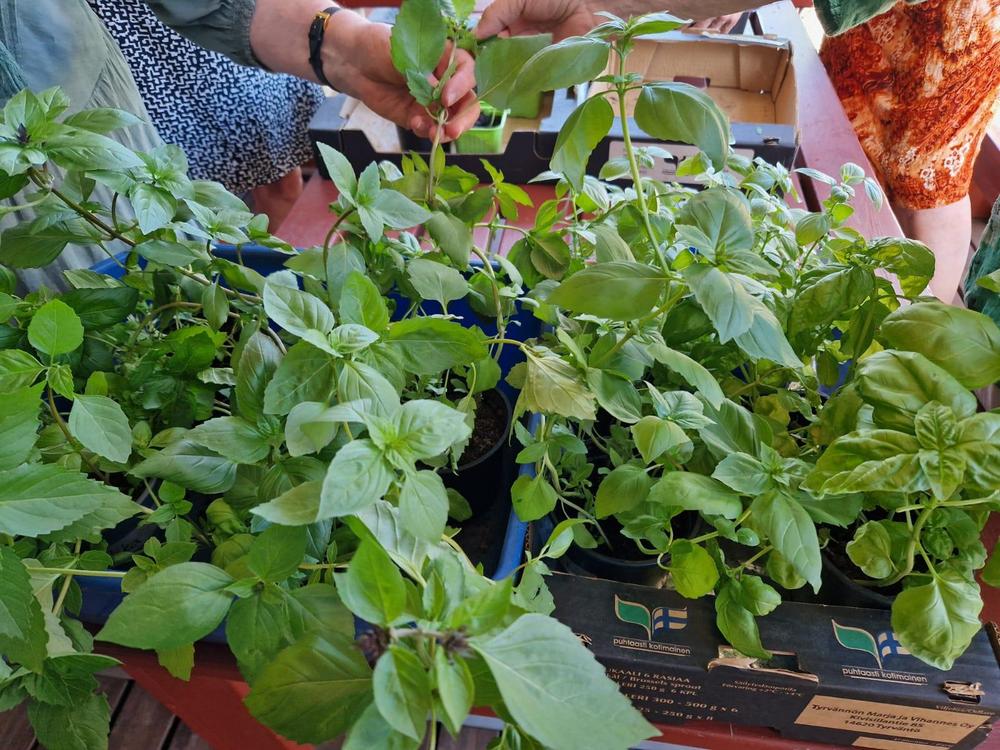 Kotiniemen puutarhapirtti kokosi tänään Keski-Lahden Martat ja siirtolapuutarhayhdistysen väen basilika- ja villyrtti-iltaan. Pirtin täytti yli 40 innokasta osallistujaa ja alkukesän aurinkoinen tunnelma! Skoolasimme tilaisuuden avatuksi kuusenkerkkäjuomalla - kiitos Leila Kekkoselle juomasta ja sen reseptistä! Puheenjohtajamme Ulla Laaksonen saatteli kuulijat aiheeseen basilika- ja villiyrttitietoiskuilla. Opimme muunmuassa, että vuoden 2024 kasvis basilika sopii moneen ja on kolmanneksi suosituin kauppayrtti, vaikka haastavan herkkä kylmälle. Ullan upeat basilikamaistiaiset kirvoittivat kielenkannat: ”onpas sitruunabasilika kirpeää, selvä kanelin aromi tässä, voi miten isot ja miedon makuiset lehdet salaattibasilikassa.”