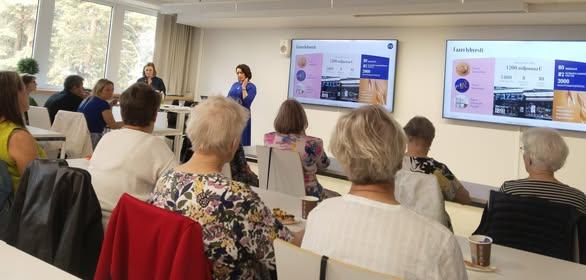 Saimme iloksemme tutustua yrityksen toimintaan hallitus-marttamme Taija Feldtin johdolla,joka työskentelee Fazer Myllyllä.Taija kertoi meille liiketoiminnasta,Fazerin ikonisistakin tuotteista ja toki kaurasta,jota Lahden Myllyllä käsitellään huimia määriä vuosittain.Fazer tuottaa myös uusia innovaatioita ja tuote-uutuuksia kaiken aikaa;tämän ja paljon muuta mielenkiintoista opimme Taija esityksestä.Kuulimme myös kuulumisia tulevasta Fazerin makeistehtaasta,joka rakentuu Kujalaan-havainnekuva lupaa hyvää-niin rakennuksena kuin sen tuottamina tuotteinakin.