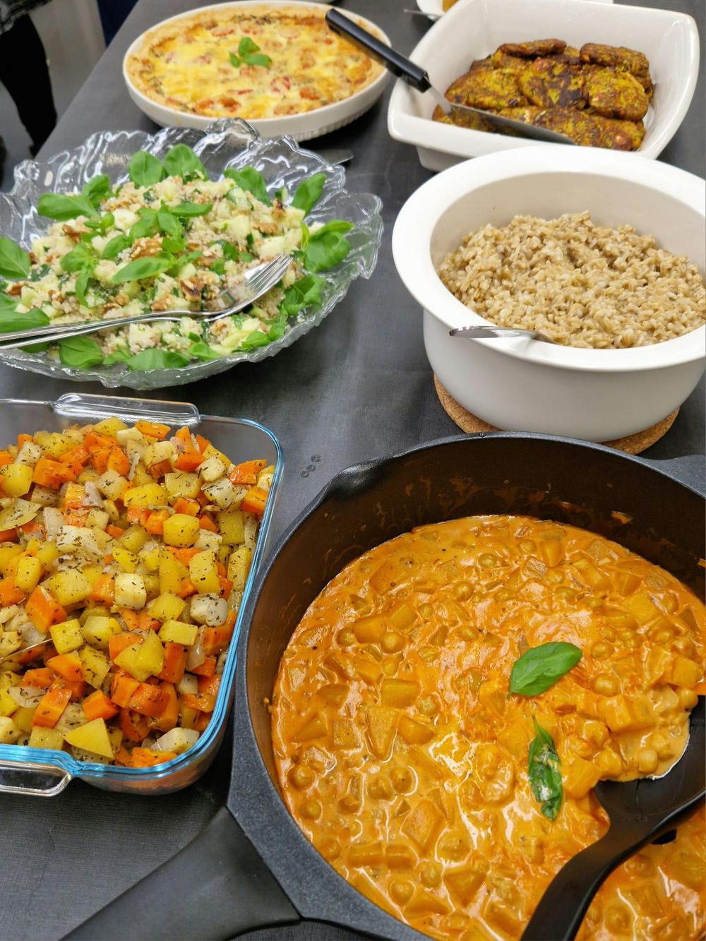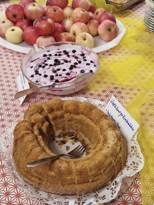 Tänään kokoonnuttiin sadonkorjuujuhliin nyyttikestien merkeissä. Tupa oli täynnä väkeä ja pöytä notkui toinen toistaan ihanampia herkkuja. Tarjolla oli mm. kasviskeittoa, fenkolileipää, sienilevitettä, salaattia, suolaisia ja makeita leivonnaisia sekä mustaherukkarahkaa.