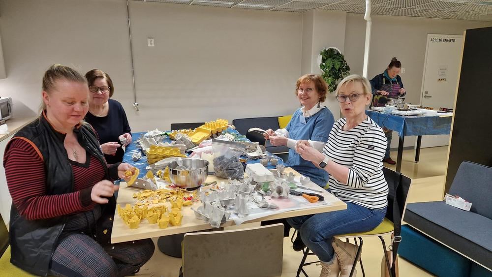 Tehtiin sytykeruusuja munakennoista ja kynttilänpätkistä sekä kosteutta pitäviä istuinalustoja kierrätysmateriaaleista. Paikalla oli 14 innokasta marttaa. Kiitos kaikille osallistujille!